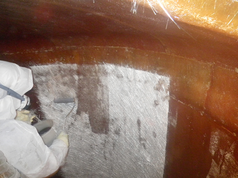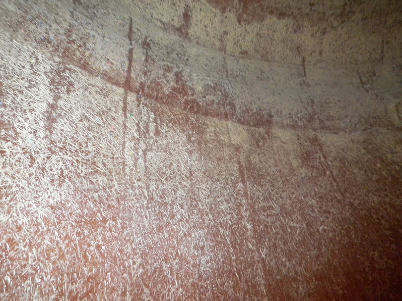タンクのコーティングが劣化し、本体のガラス繊維内へ汚れが浸食した状況。